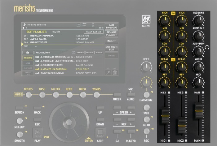De M-Live Merish5+ is een krachtige standalone muziekworkstation voor zangers, entertainers en live muzikanten die hun volledige optreden vanuit één apparaat willen aansturen. Deze all-in-one backing track player speelt MIDI, MP3 en multitrack backing tracks af terwijl je tegelijk twee microfoons en twee line-inputs mixt met professionele effecten en uitgebreide EQ.