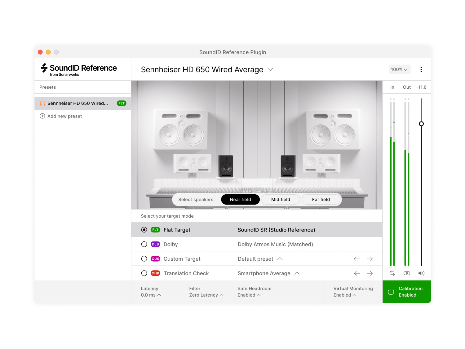 De geavanceerde functionaliteit van de software omvat aanpasbare doelcurves, simulatiemodi voor realistische afspeelomgevingen en selecteerbare filteropties voor tracking zonder latentie of lineaire faseprecisie. Voor gebruik met een hoofdtelefoon biedt SoundID Reference meer dan 500 vooraf gekalibreerde profielen om dezelfde nauwkeurigheid en tonale consistentie te bereiken als een afgestemde studioruimte.