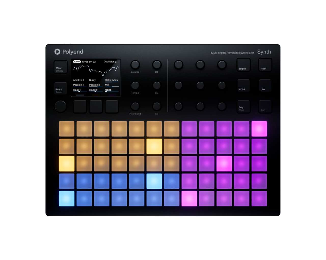 In zijn kern biedt de Polyend Synth ware standalone synthese met meerdere engines die een breed palet aan tonen dekken - van rijke analoge warmte tot complexe digitale texturen en evoluerende geluidslandschappen. De intuïtieve interface mengt een hoogwaardige display, responsieve encoders en een raster van pads die het programmeren van geluiden, het vormen van sequenties en het aanpassen van prestatieparameters snel en muzikaal maken.